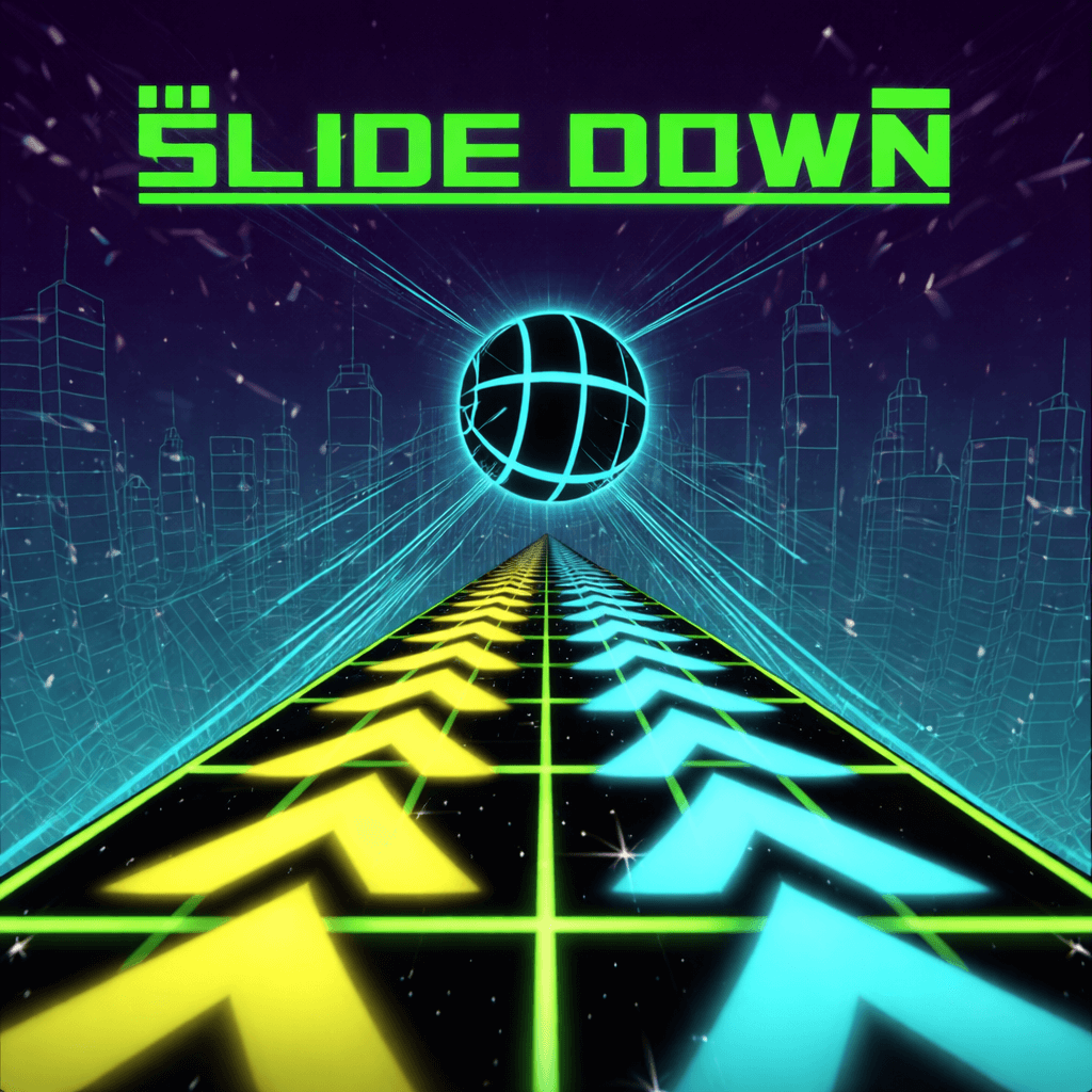 Slide Down, a 3D infinite runner arcade game, lets you control an auto-rolling ball down dangling slopes with obstacles. Simple goal: survive. Avoid sharp edges, empty holes, deadly blocks, and other traps. As the ball speeds up, the game finishes when it collides or falls off the track.